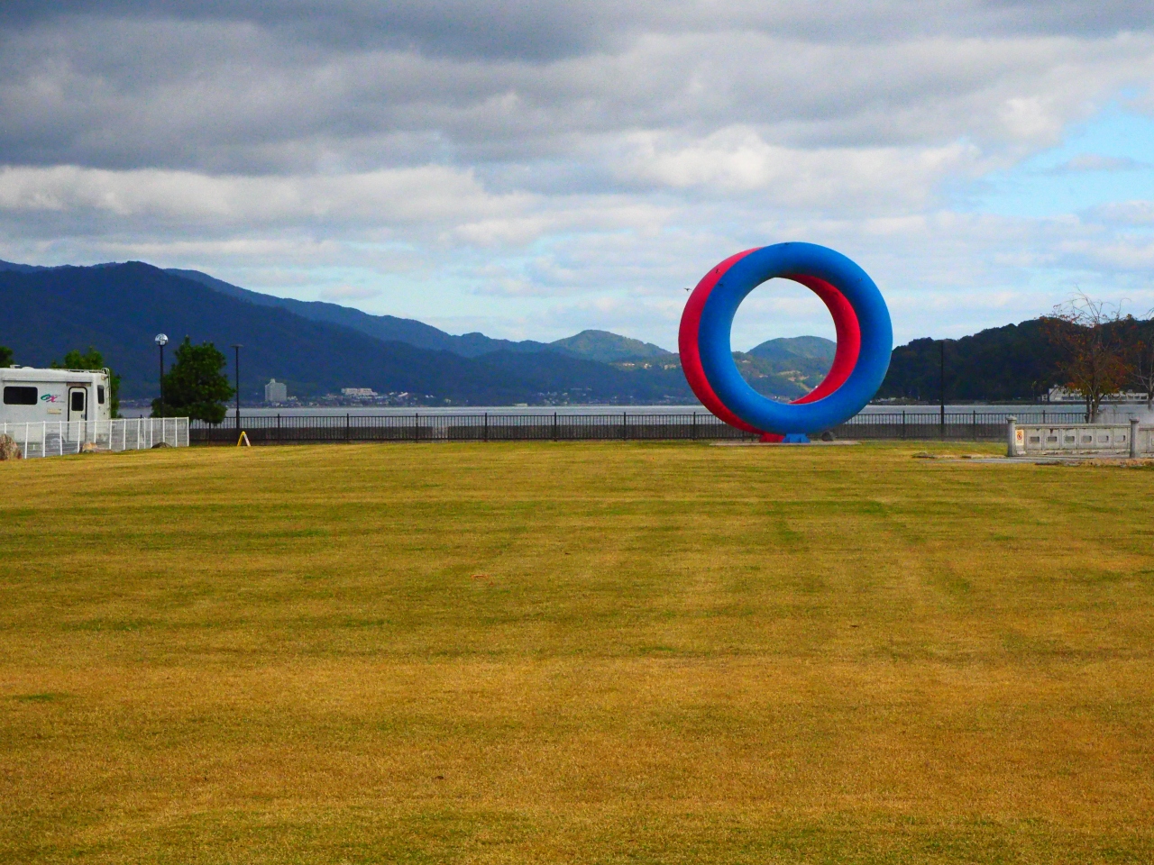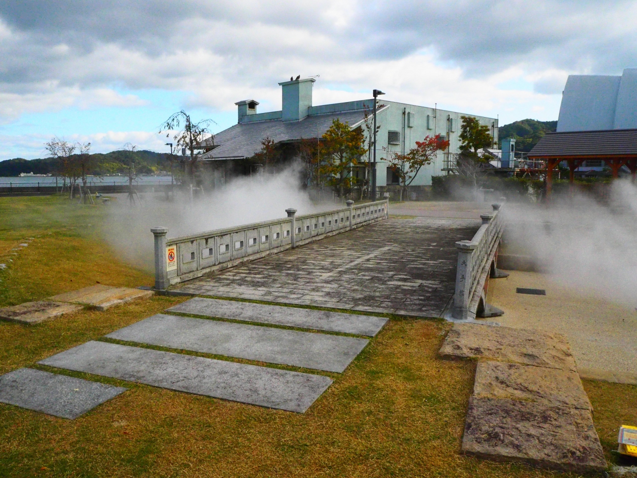 島崎公園は宮津駅から歩いて15分ほどの宮津市街地の海側に広がる大きな公園です。公園の近くには大型商業施設や観光案内所、道の駅もあり、結構多くの人がきているようです。公園内は宮津城の堀に架かっていた大手門橋の縮小したものがあります。コンクリートの橋で、橋は渡れます。