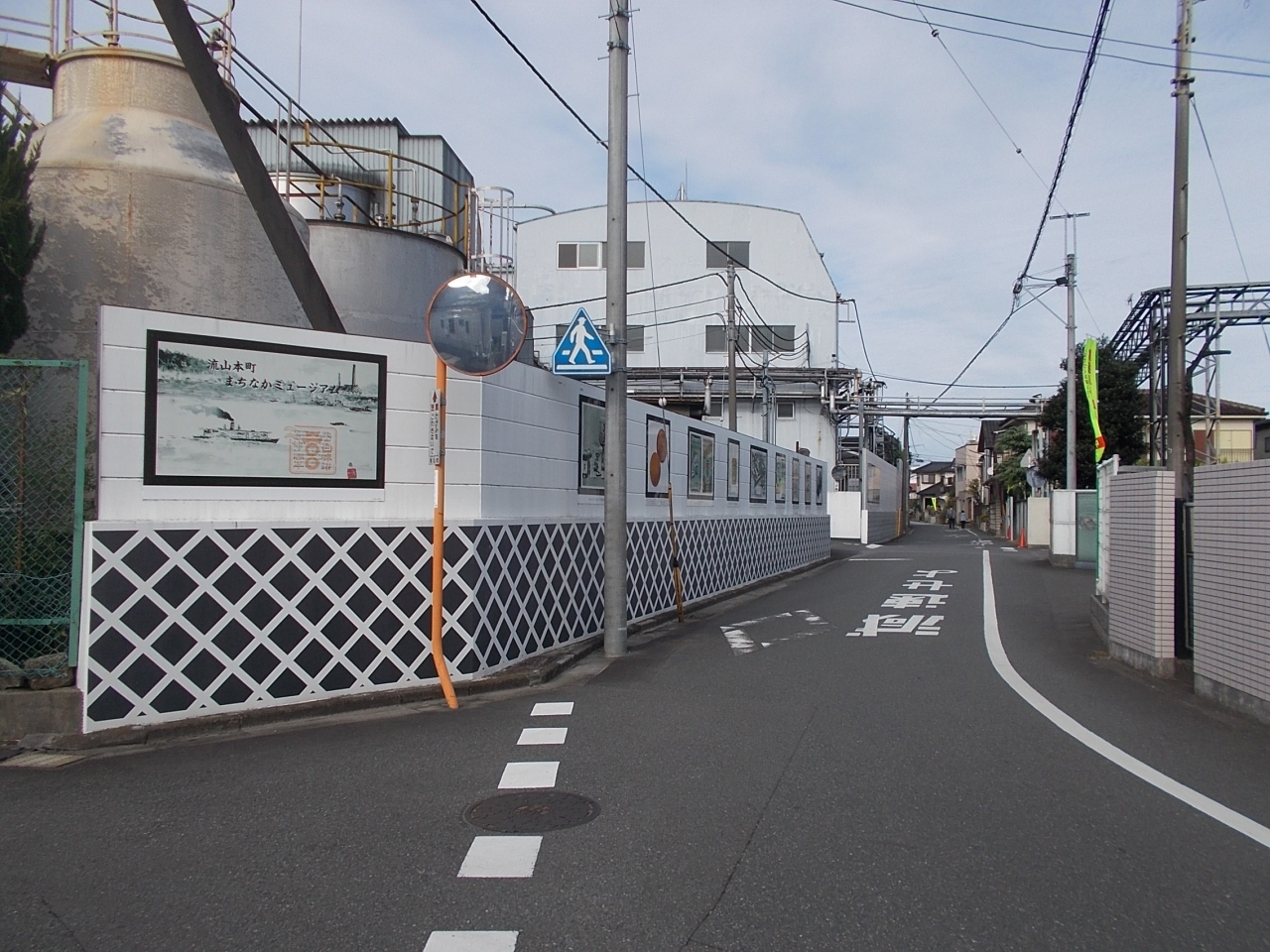 この流山本町まちなかミュージアムは流鉄流山線の流山駅から南西の5分強の場所にある流山キッコーマンの工場の外壁を活用しています。そこにこの工場でつくられたいる万上みりんの商標などや流山の水運などのかつての姿のどの画を掲示しています。雰囲気がある空間になっています。