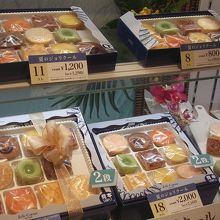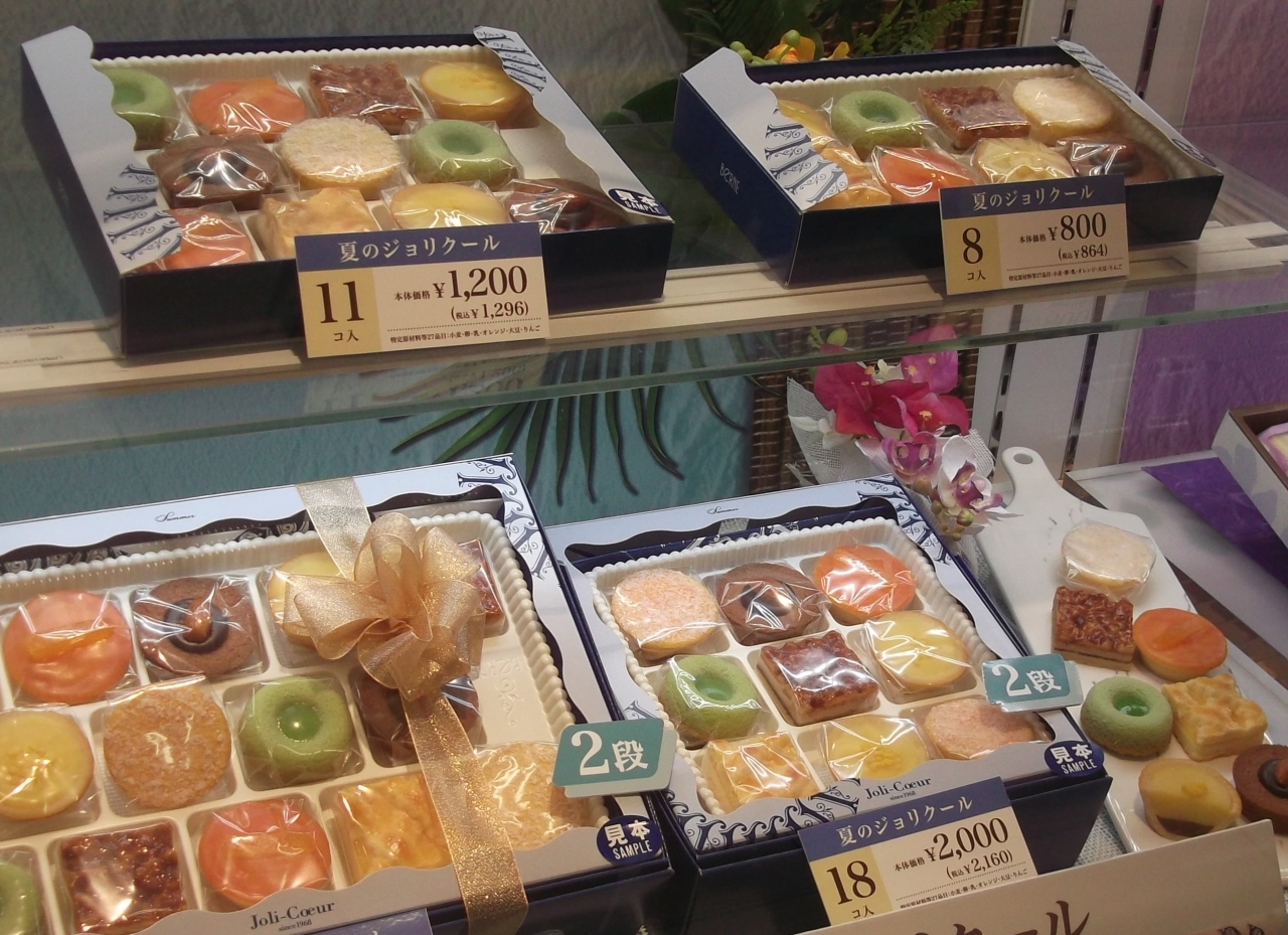 日本橋三越地下にある、チョコレートでコーティングしたミルフィーユで知られる洋菓子のベルンのショップです。ここのもう一つの人気商品、ジョリクールの夏バージョンが販売されていました。メロン、ココナッツ、マンゴ、グレープフルーツなど夏らしい味がそろっていて、色とりどりの見た目もきれいな焼き菓子でした。