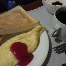 トースト、オムレツ、ヨーグルト、ドリンクから成る(野菜感は少ない)。