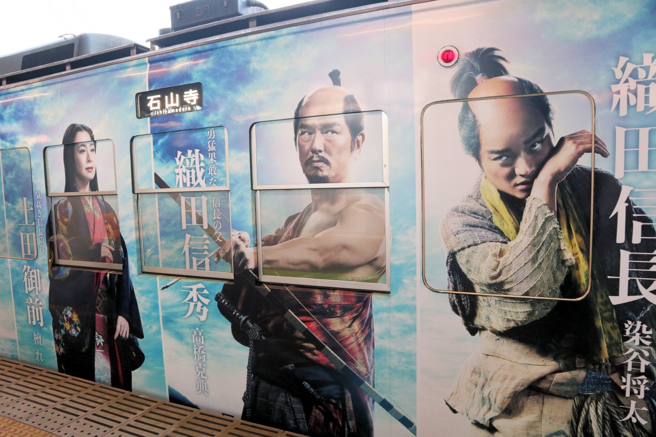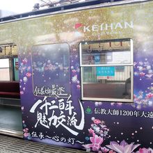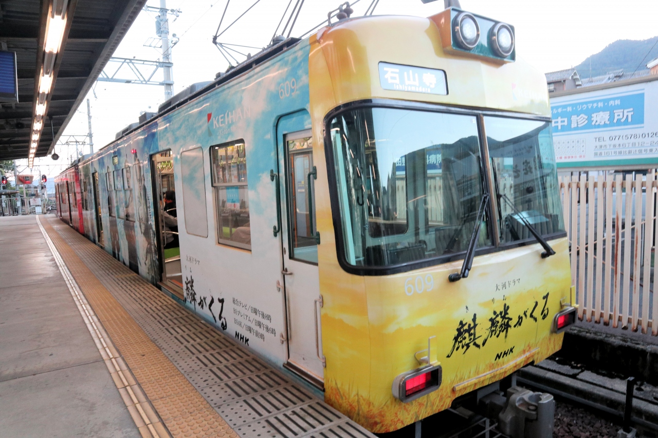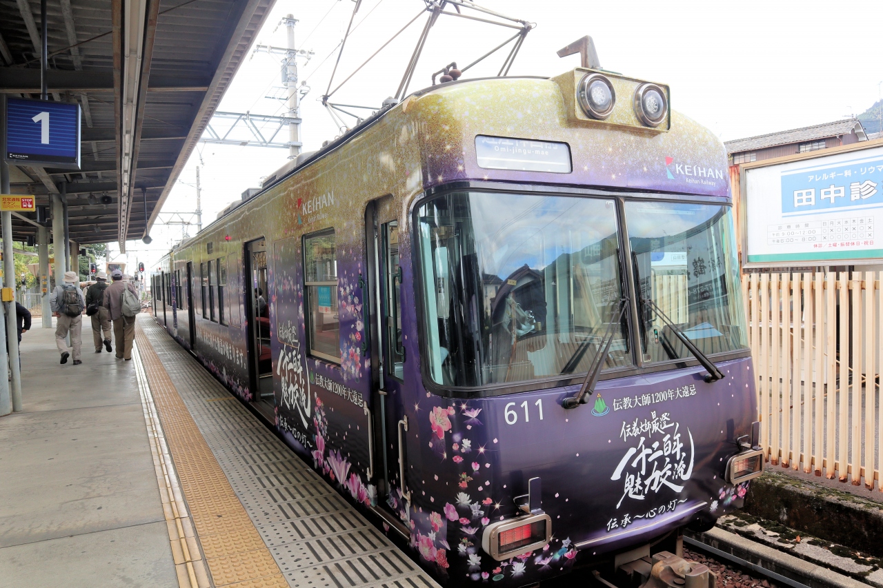 比叡山への玄関口となる坂本まで走る電車なので、今年の大河ドラマ「麒麟がくる」と、「伝教大師1200年大遠忌」のラッピング電車が走っていました。