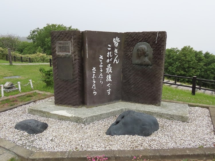 稚内公園の中の氷雪の門の近くにある碑です。樺太の真岡郵便局の9人の電話交換手の若い女性たちが終戦直後に上陸・侵攻してきたソ連軍に身の危険を感じて自決した悲しいエピソードを記したものです。「みなさん、これが最後です。さようなら、さようなら……」が最後のメッセージだったと碑文にありました。