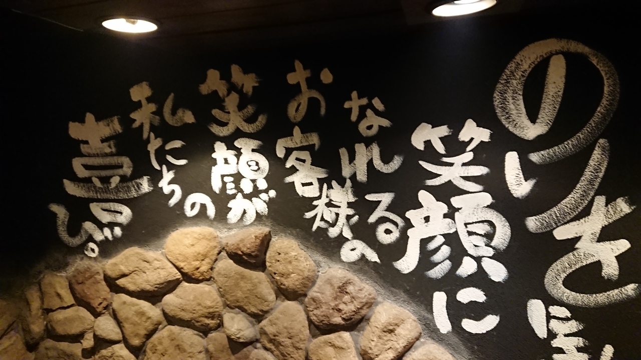 ミナミに宿泊した際、ホットペッパーグルメを使い予約しました。駅からも近く利用しやすかったです。メニューはタッチパネルに載っており、オーダーもタッチパネルから出来るようになっています。料理も飲み物も種類豊富で料理も美味しくいただきました。入り口の壁に書かれている言葉が好きです。
