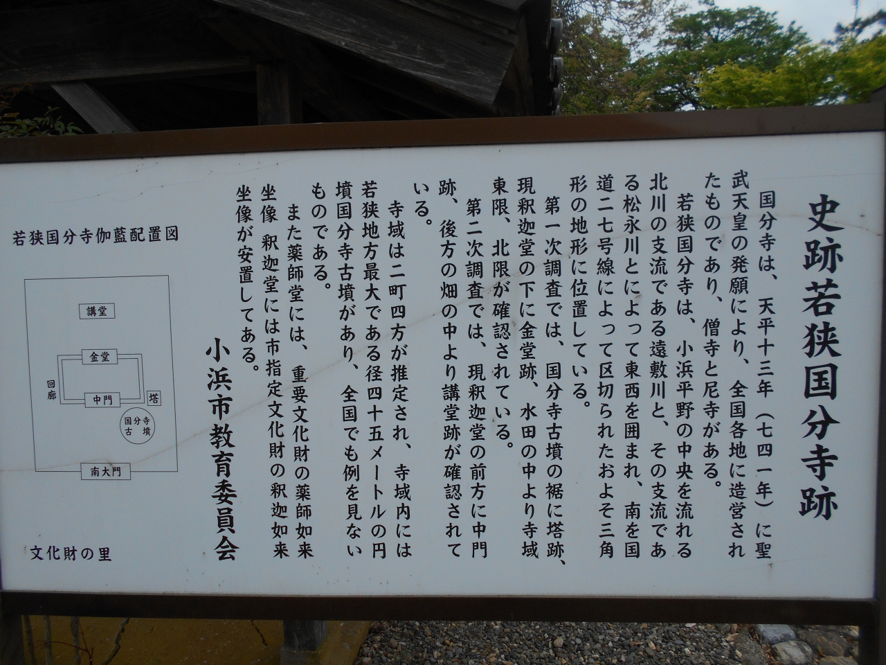 現在の国分寺は東大寺建立の少し後の8世紀中ごろに創建された若狭国国分僧寺の後継寺院です。当時、若狭地方の中心が小浜であったことが伺えます。現在の釈迦堂は若狭国分寺の金堂があった場所に建っています。また、境内には国分寺古墳があります。直径約50メートルと若狭地方では最大級の円墳で、6世紀頃の築造と推定されています。