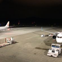 長崎空港の無料展望デッキです。ターミナルビルの3F、屋外にあります。目の前に、駐機中の飛行機が見えます。夜も開いているので、暗闇の中の離発着を見ることができます。ターミナルビルの上には、長崎らしく、鐘のモニュメントも見えます。