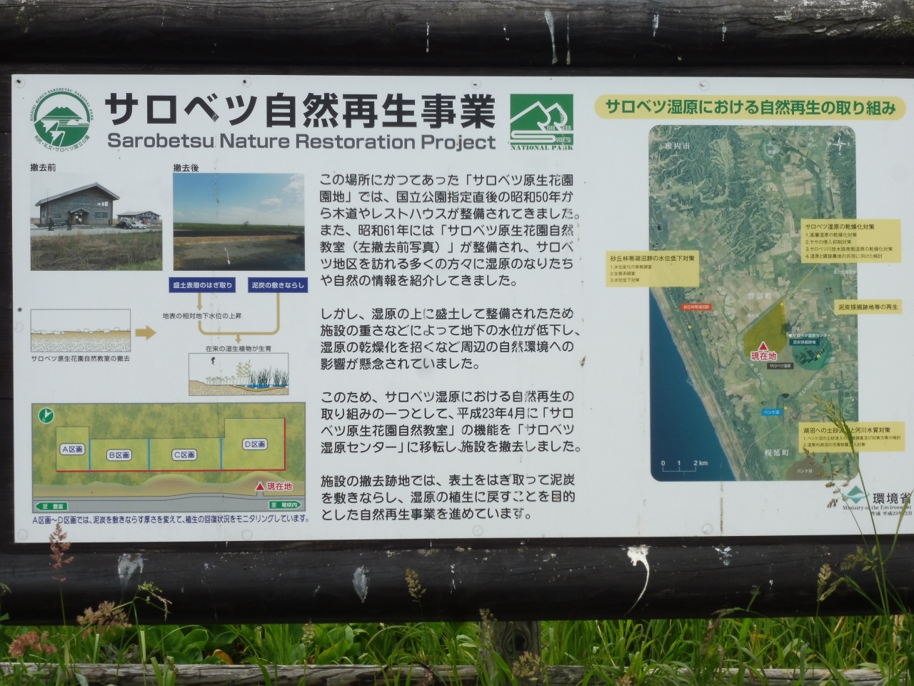 現在かつて盛んだった泥炭採掘跡や農地として開拓された部分や灌漑や排水用水路の設置によっての水位の変化そして用水の使用停止・サロベツ原生花園廃止後の湿原の自然再生が各地で行われてました。