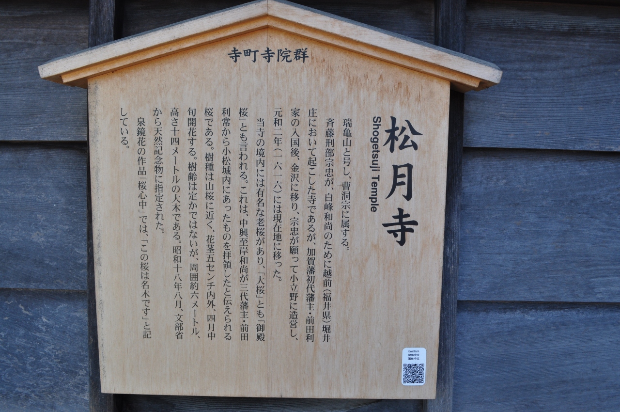 2020年6月後半に金沢を旅行した際に立ち寄りました。野町広小路交差点から徒歩5~6分程、寺町寺院群の寺町通り沿いにある曹洞宗の寺院になります。今から430年ほど昔の文禄2年(1593年)に創建された寺院です。「松月寺の大桜」という立派な桜の木がありますので、桜の季節には見事な花を咲かせてくれるものと思います。広い境内と綺麗な本堂、そして小さいながらも綺麗な山門がありました。桜の時期に来てみたい場所ですね。