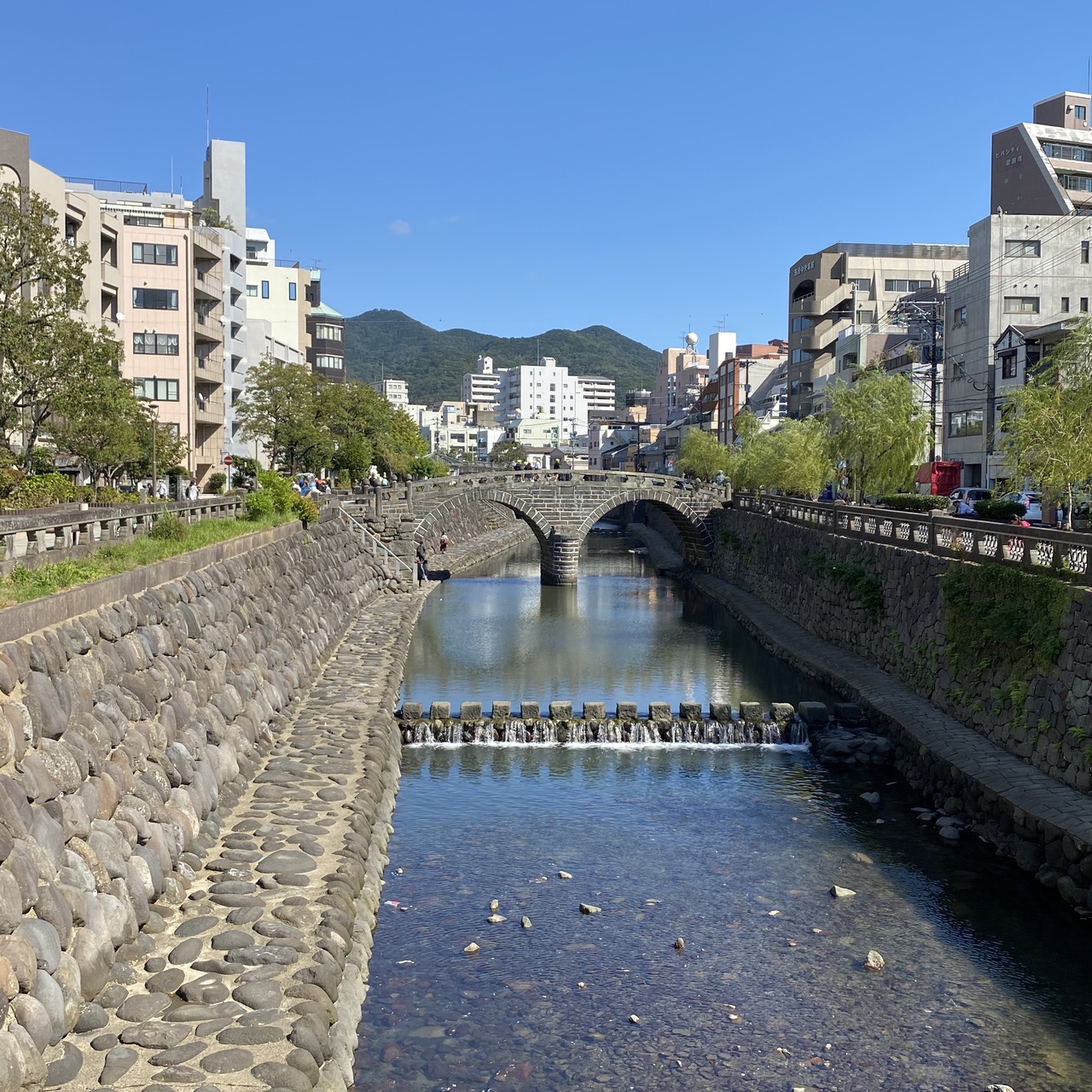 長崎駅から徒歩にて向かいました。橋が側に写って眼鏡に見えることからこのような名前がついていますが、あまり水面の状態がよくなかったのできれいには映らず残念でした。定番の観光スポットと言えるので人も多い場所です。