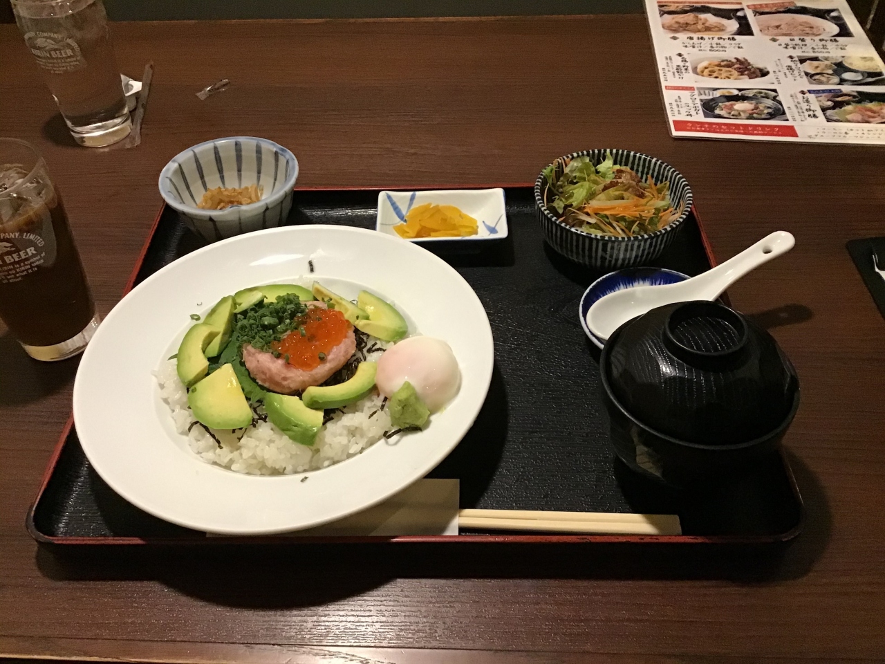 日替りがサバ味噌とのこと、唐揚げと迷いましたが、マグロとアボカドのユッケ丼を選択しました。