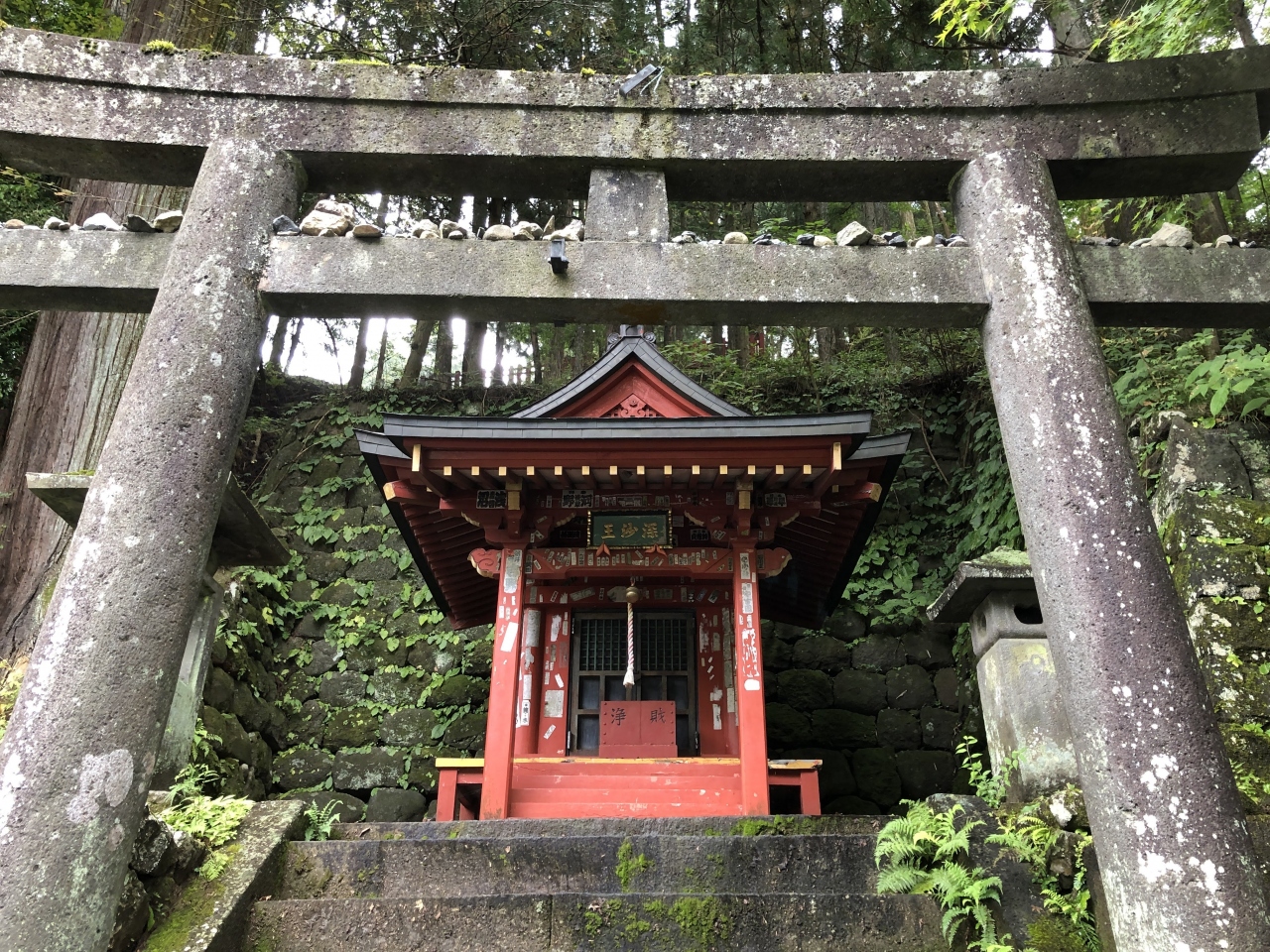 神橋の近くの太郎杉の隣にあります。日光を開山した勝道上人(輪王寺に像があります)らが大谷川を渡れないで困っていたら、「深沙大王」が二匹の蛇を放って助けたということに由来しているそうです。神橋の上からも太郎杉とあわせてよく見え、神秘的な雰囲気でした。