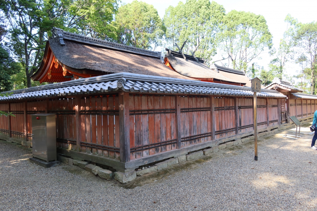仁和寺の経蔵と五重塔の間にある神社が九所明神です。三棟の社殿からなり、中央の本殿は八幡三神、左の社殿は賀茂、日吉、武答、稲荷を祀り、右の社殿は松尾、平野、小日吉、木野嶋を祀っており、計九座を祀ることから九所明神と呼ばれ、重要文化財にも指定されています。寺社にある神社としてはとても立派です。