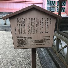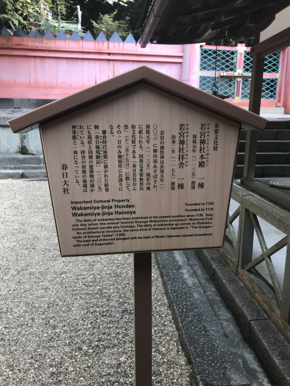 春日大社本殿から南に進んだエリアにあって、若宮神社を中心として周辺の15の神社・遥拝所などを巡る「若宮神社十五社めぐり」の拠点であり、第一番納札社となる等、中心的な存在となっています。建立は平安時代の後期と考えられています。