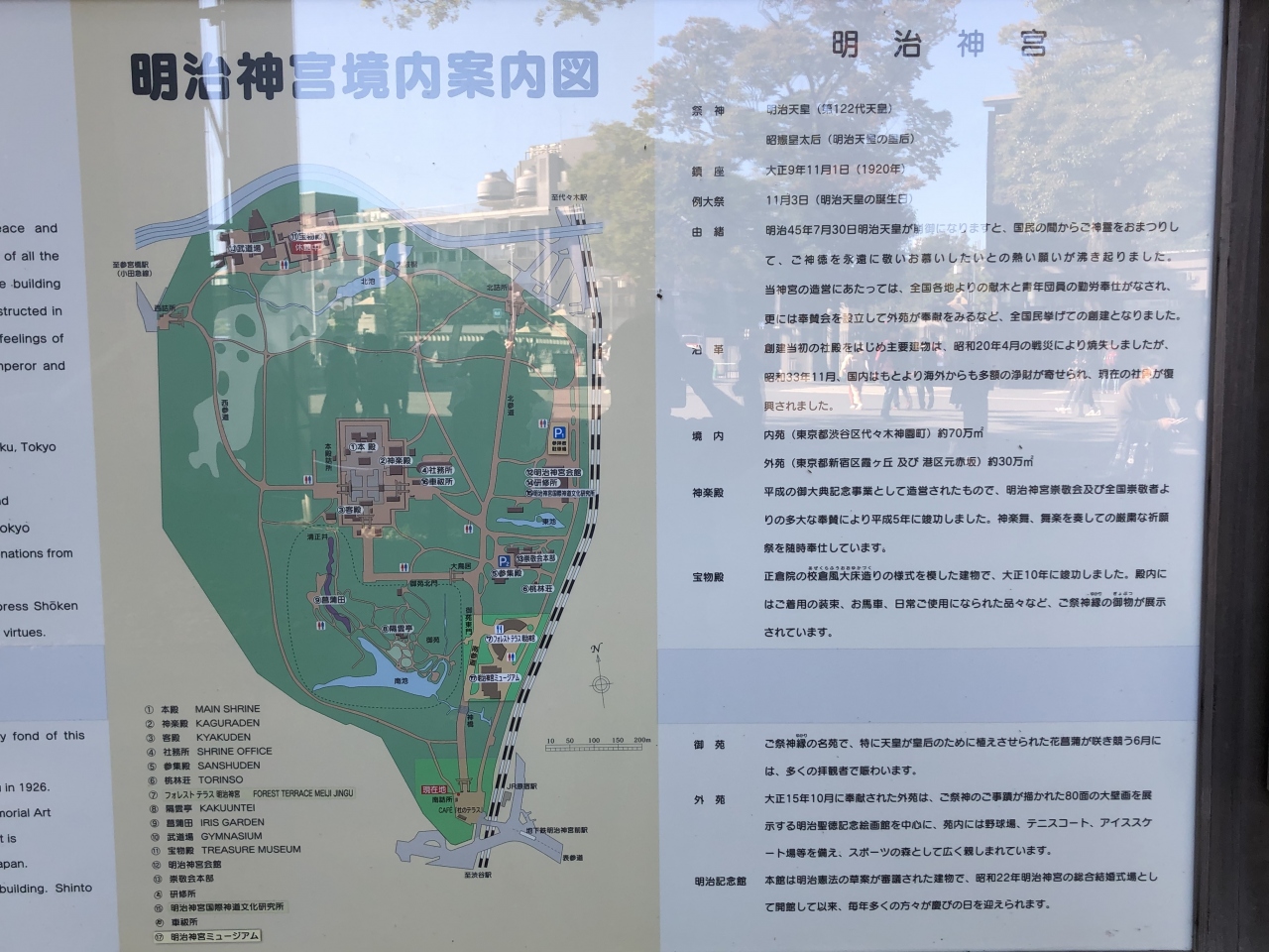 高輪から徒歩で散策し、明治神宮を初めて参拝した。明治天皇と昭憲皇太后を御祭神とする。1920年創建なので100年前のことである。約2000年の歴史を持つ伊勢神宮、熱田神宮とは歴史的には比較にならない。面積は73ヘクタールあり、伊勢神宮は5500ヘクタールと別格で、熱田神宮の60ヘクタールよりひと回り広い。最寄駅はJR原宿駅、小田急線の参宮橋駅など、広大な面積のため、本殿まではかなり歩くことが必要である。