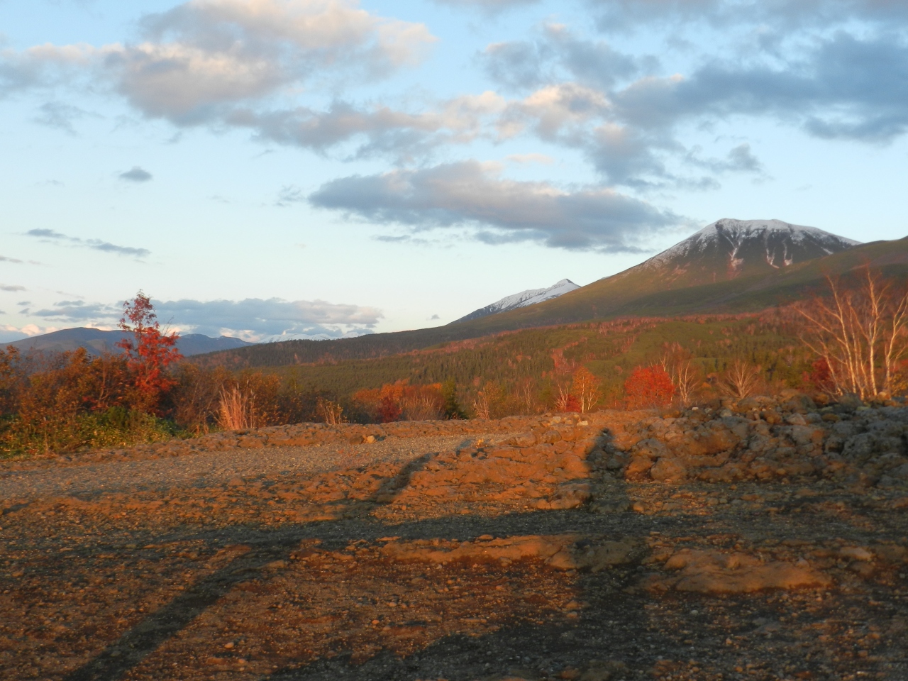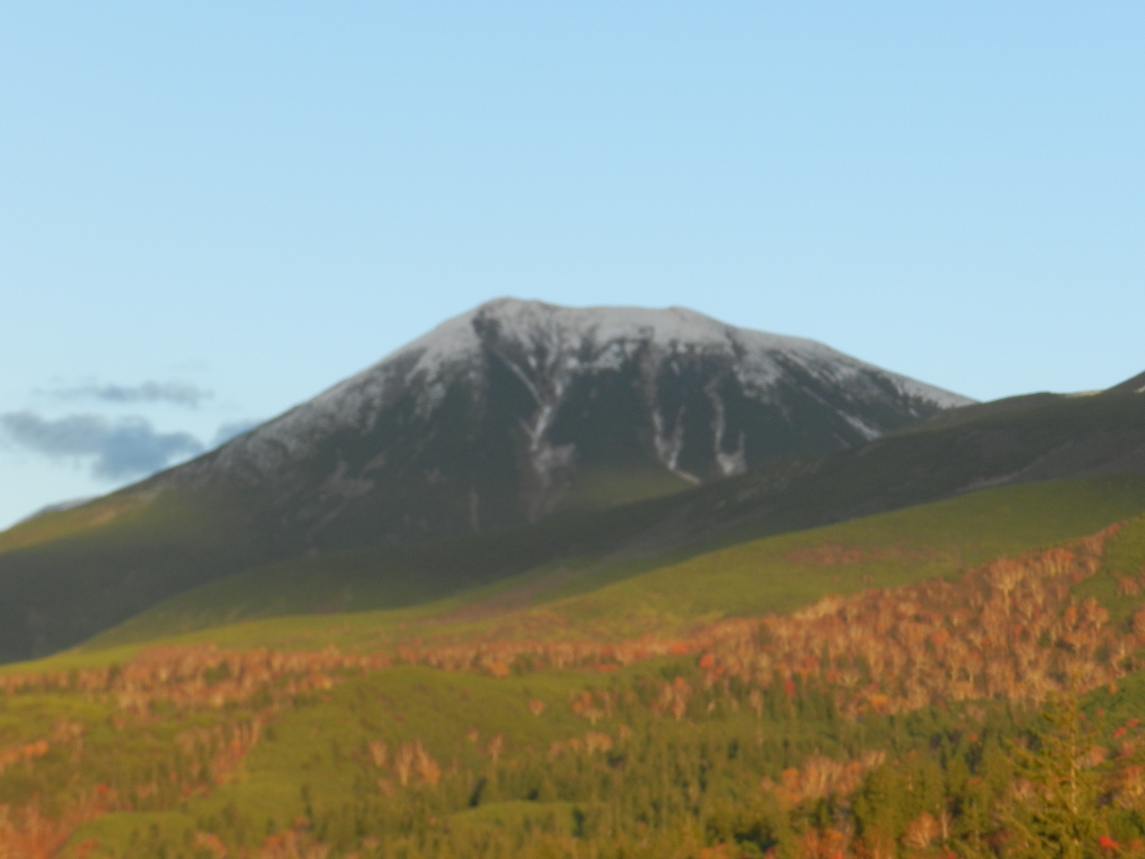 今も噴煙を上げる十勝岳望岳台から見上げる美しい山々の一つ。主峰十勝岳の北東に座す標高1,888mの火山で十勝岳の火山活動で1万年前に形成されたと言われます。今は火山活動は見られず大雪山国立公園の一部となって美しい姿を見せてくれます。中腹から雪に覆われ麓が紅葉で美しくなって見事です。