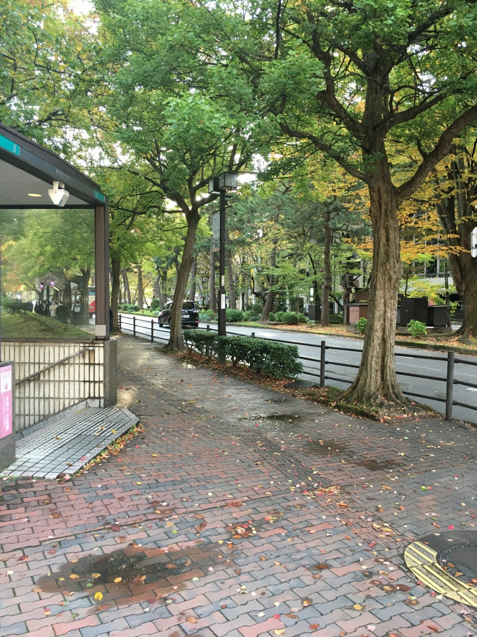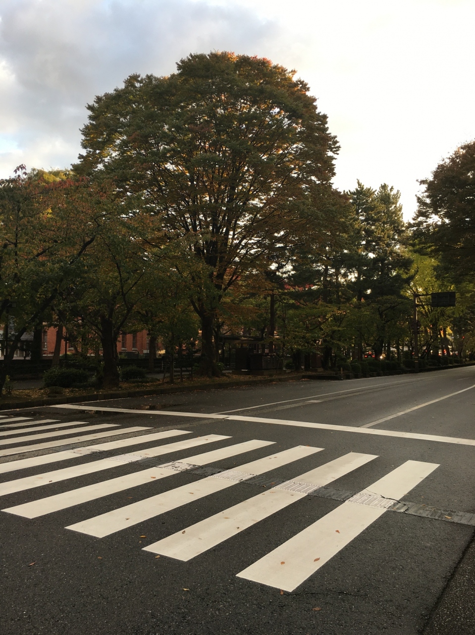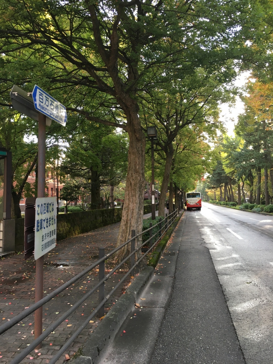 香林坊から金沢城公園付近まで歩きました。片側2車線の車道で沿道には木が連なり良い雰囲気でした。沿道の左側は公園も広がっていました。朝だったので車は場所少なかったですが路線バスは結構見かけました。歩道には落ち葉もも落ちていました。