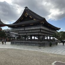八坂神社本殿前にある「舞殿」は、奉納行事のほかに結婚式も執り行われる舞台です。花街の置屋や料亭から奉納された数多くの提灯は、毎晩明かりが灯されるようです。舞殿は幕末の火災で焼失していて、現在の舞殿は1903年に再建されたものです。