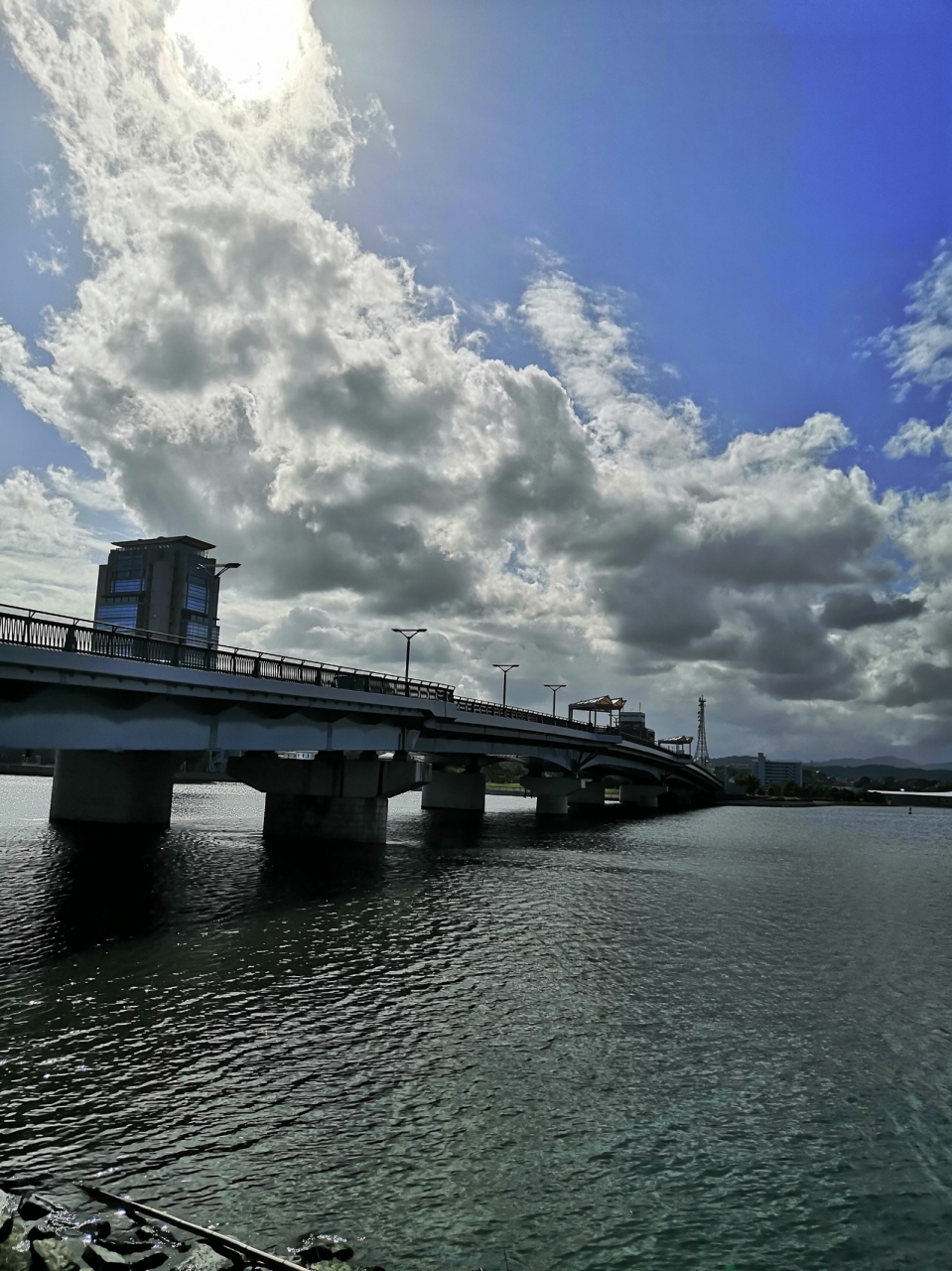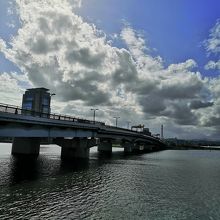 大橋川によって松江市は南北に分かれていて、そこを何本かの橋で結ばれていますが、そこ中で最も西に位置し、宍道湖自体に架かってているという点では雄一の橋がこちらになります。橋自体はまあ普通ですが、こちらからの眺めはいいです。