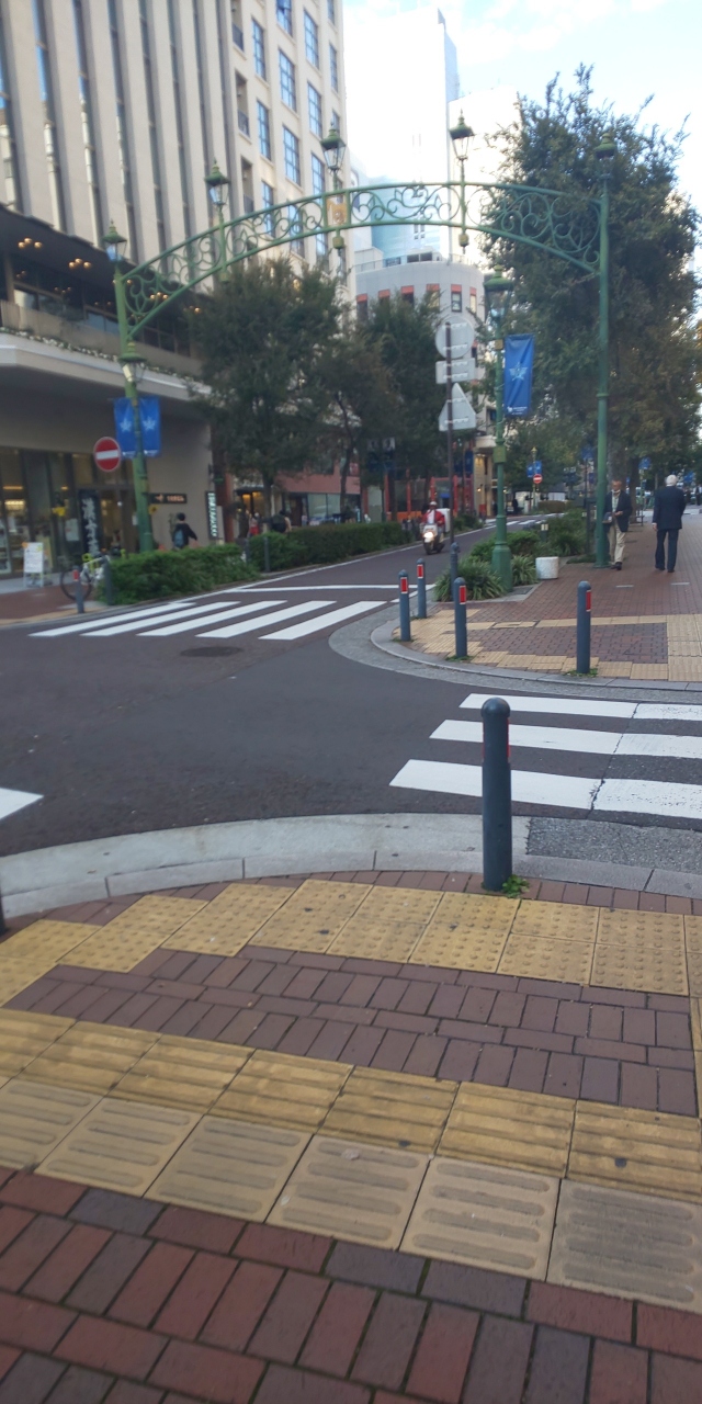 レトロ建築もところどころにみられ、レンガ色の地面のタイルと街灯が昔ながらの横浜らしいところでした。街路樹も植えられています。