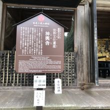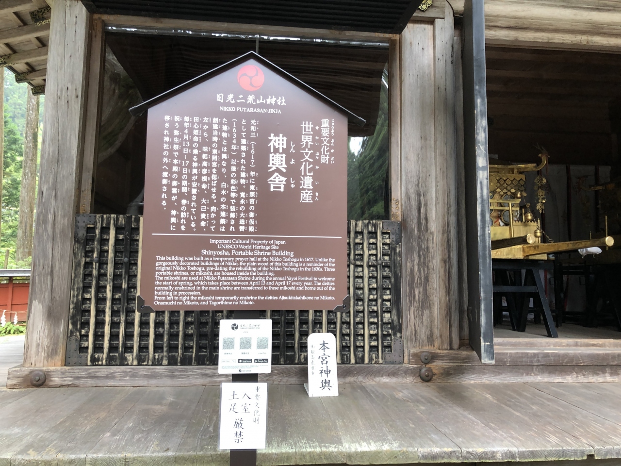二荒山神社にある1617年に建てられた建物で、「しんよしゃ」と読むそうです。御神輿が3つ置いてあるようで、特に中央のものは外側からもよく見えました。シンプルな建物の中にきらびやかな御神輿があり、お祭りのときのにぎやかな音が聞こえてくるようでした。