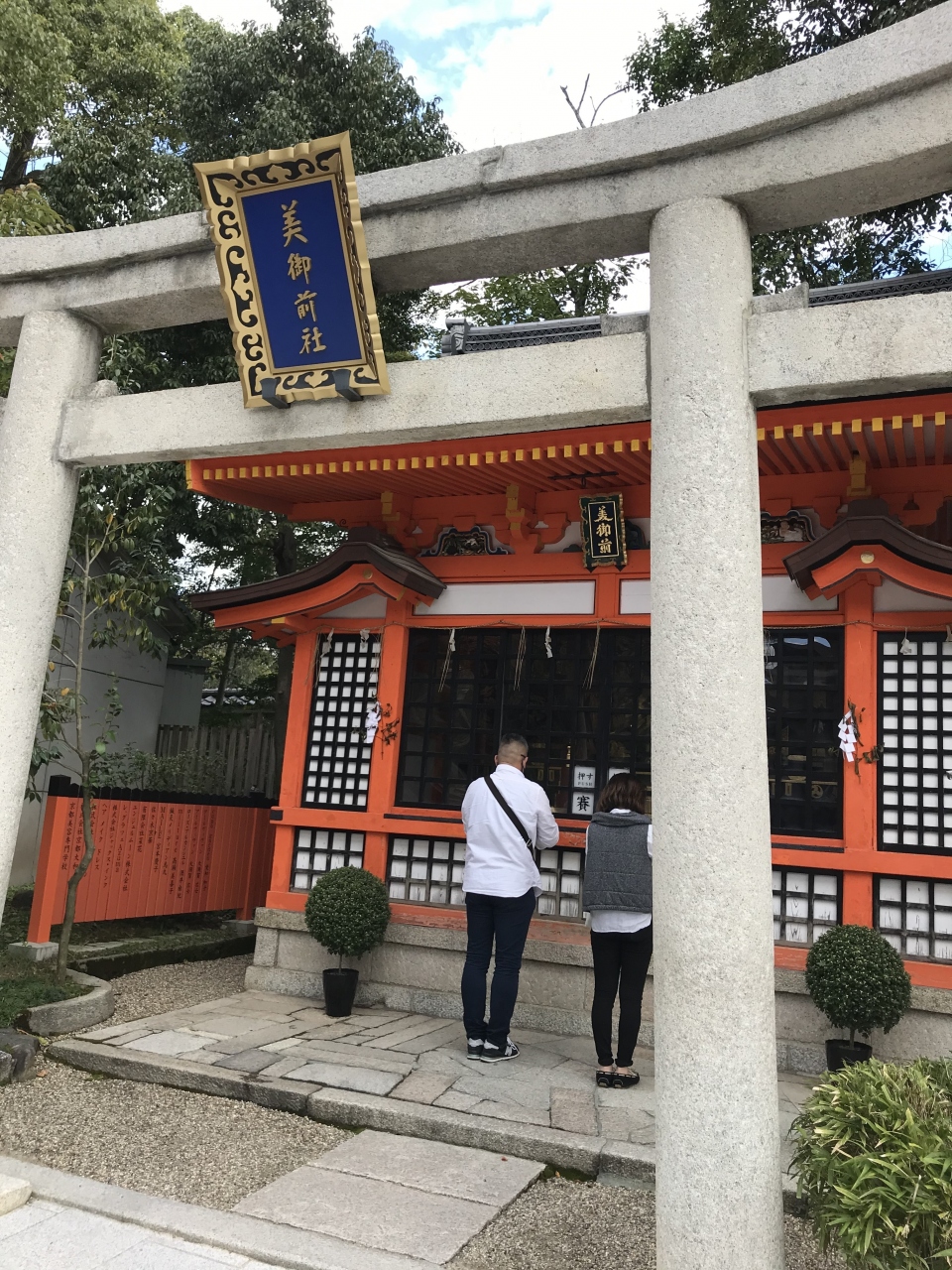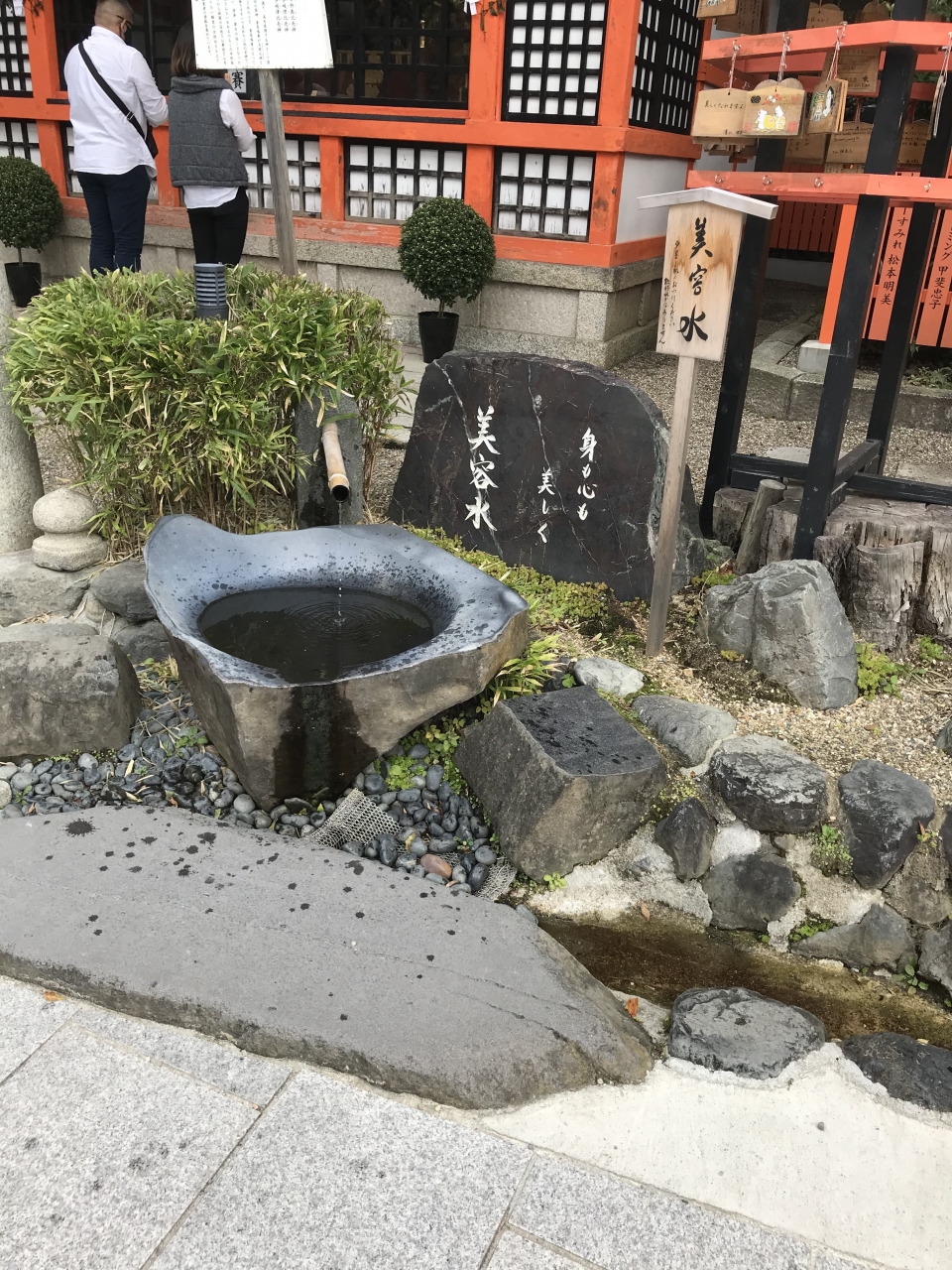 美御前社(うつこしごぜんしゃ)は、美貌、芸能、財福の神様としての信仰があって、京都の舞妓さんをはじめ、美容に関心のある多くの女性が参拝におとずれています。社殿の前には「美容水」が湧き出ていて、肌につける女性を数多く見かけました。