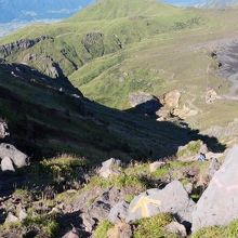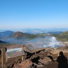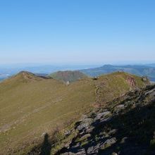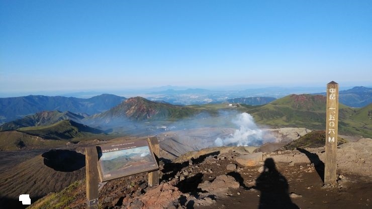 中岳からは道中の絶景に感動しながら高岳に向かう。高岳からは外輪山に囲まれた麓の風景が見える。中岳とは違った絶景が楽しめた。