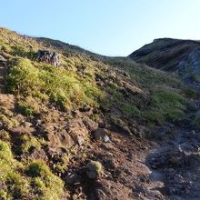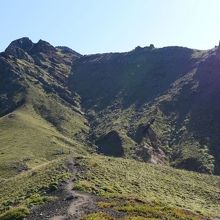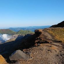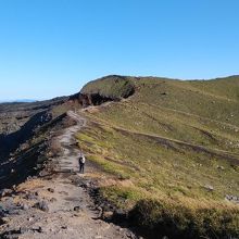 始めは火口見学までのアスファルト歩道を進む。砂千里に入ると火口から遠ざかっていくので、火口見学はできなくても登山はできることに納得。砂千里を過ぎると外輪山の尾根までの登山道が始まる。尾根に上がるまでは岩のごつごつした傾斜があるが、ここをクリアすると尾根上の景観の良い緩やかな道に。