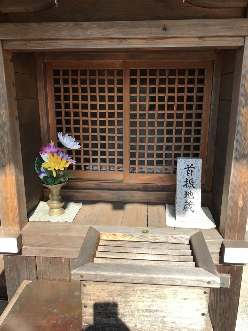 現在の首ふり地蔵(二代目)は出張中なのか、その姿は見当たりませんでした。ちなみに格子戸の中に置かれているのが初代の首ふり地蔵です。江戸時代の中ごろの、ある芸姑さんにお付きの太鼓持ちの一人「鳥羽八」という方の供養のために奉納されたらしいです。