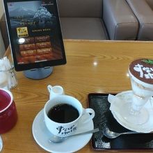 せっかくここまで来たのだから話のネタに中に入ってみた。おいしいコーヒーとパフェで時間を過ごすことができた。注文はタッチパネル式でスムーズ。