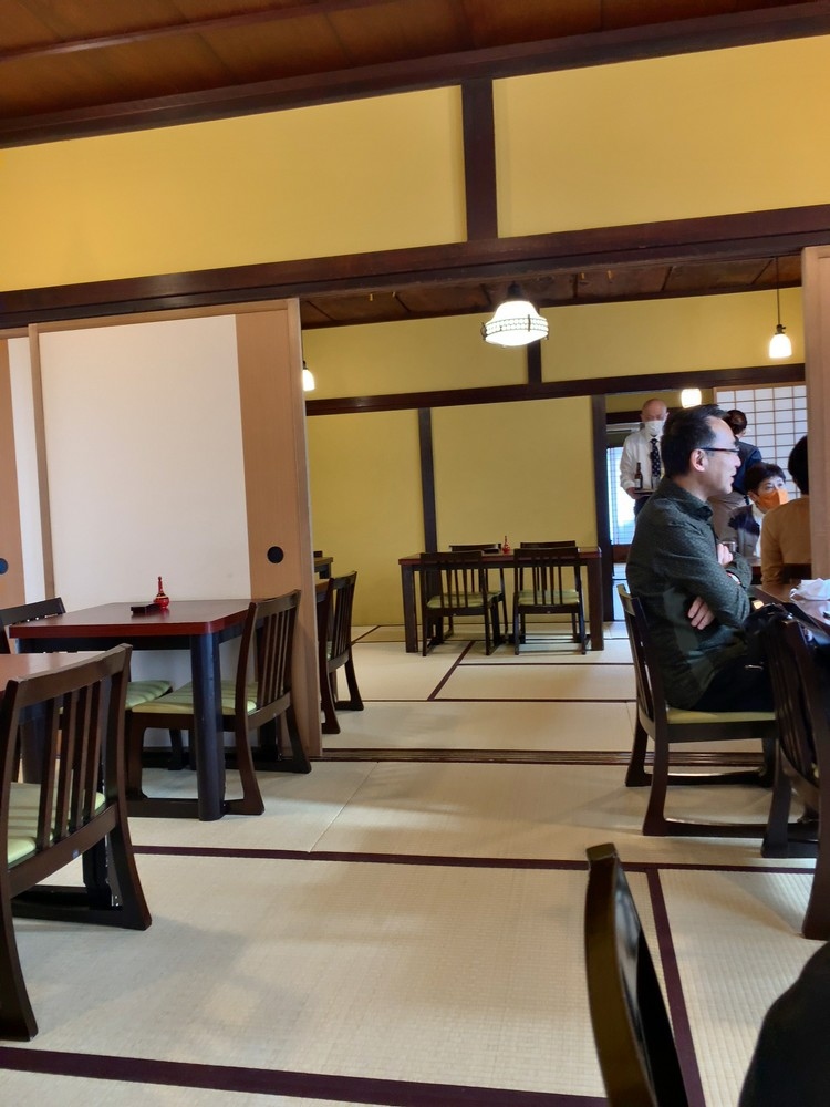 1階で靴を脱ぎ昔のままの急な階段を上り、川越祭りの山車のステンドグラスを眺めて2階へ・・・和室にテーブル席というスタイル!