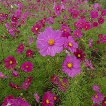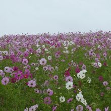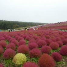 赤いコキアの中に所々、黄緑のコキアや赤くなりかけのコキアなどいろいろな色のグラデーションが楽しめます。ちょうど濃いピンクのコスモスが見頃で、こちらもきれいでした。