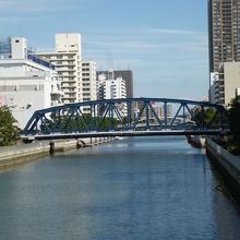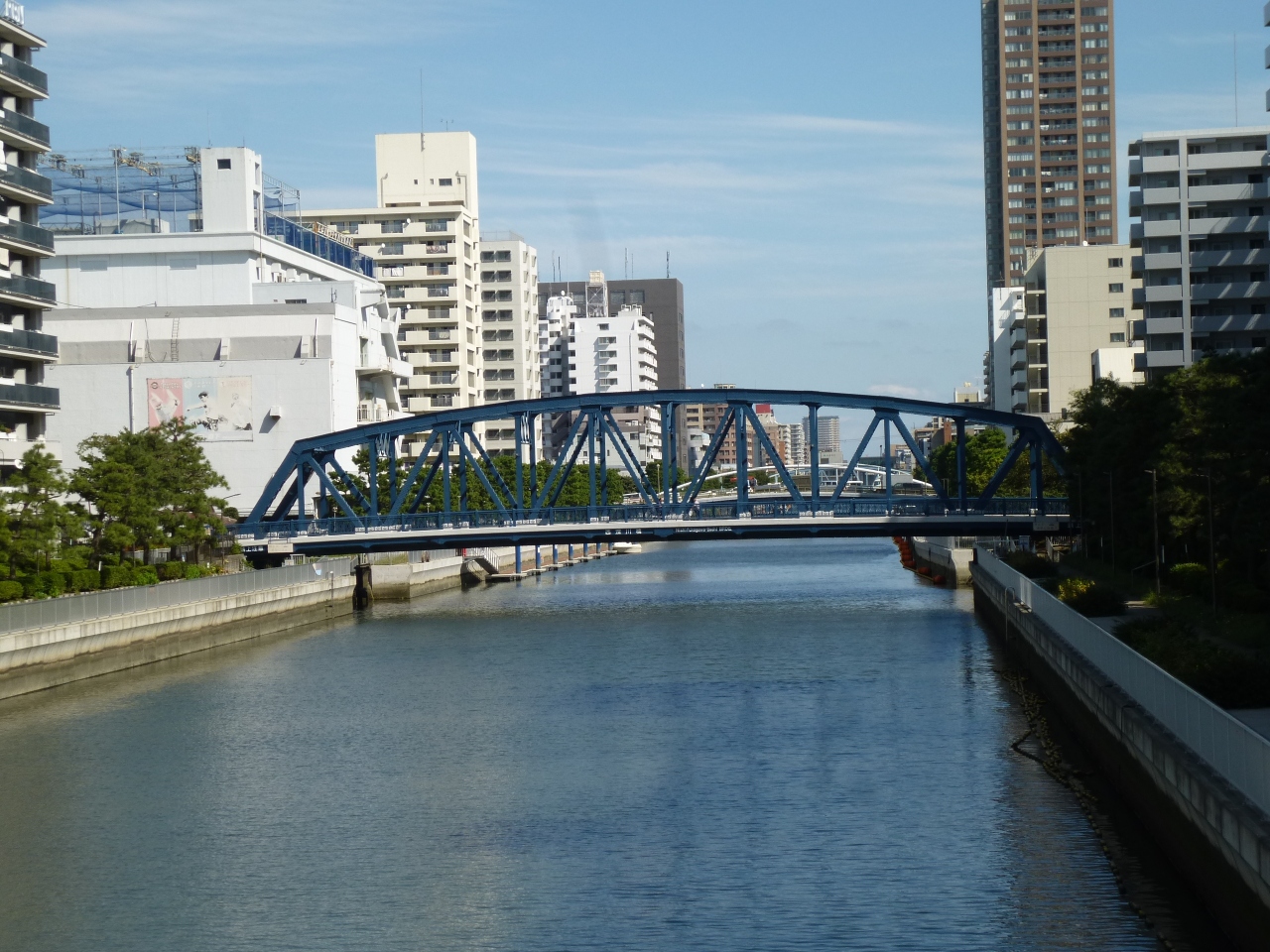 西深川橋は、小名木川に架かる橋のひとつで、1930年に竣工した歴史ある橋です。秋の空の色よりもやや濃い青色をしており、なかなか見栄えが良いです。橋の北東詰めにあるオブジェ「幸福の魚GOMBESSA」も見どころの一つです。