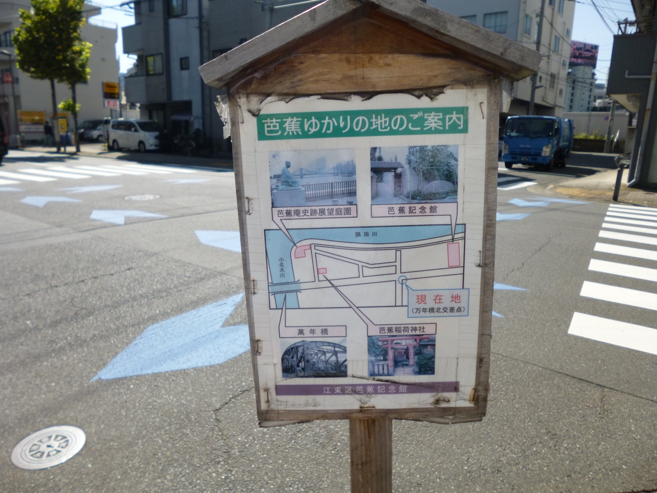 下町を東西に貫く運河「小名木川」とほぼ平行して、その約100メートル北側を東西に走る通りに「深川芭蕉通り」という名称がついています。残念ながらやや無機質な印象で、芭蕉を感じさせるものは見られませんでした。江戸時代前期、芭蕉が活躍した時代にどのような光景だったのかが気になります。