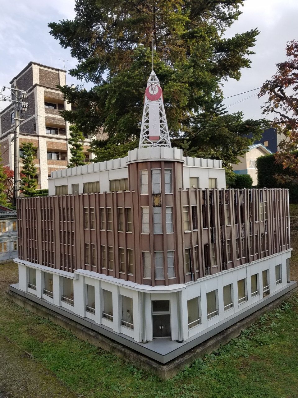 旧東奥義塾外人教師館のお庭にあるミニチュア建造物群です。弘前の有名建築物のミニチュアで無料で見学出来ます。ちょっと面白いなって思ったのが昔の弘前市民に親しまれた昔ながらのデパート、かくはデパートです。ちゃんとウィンドウにはこけしがいました笑