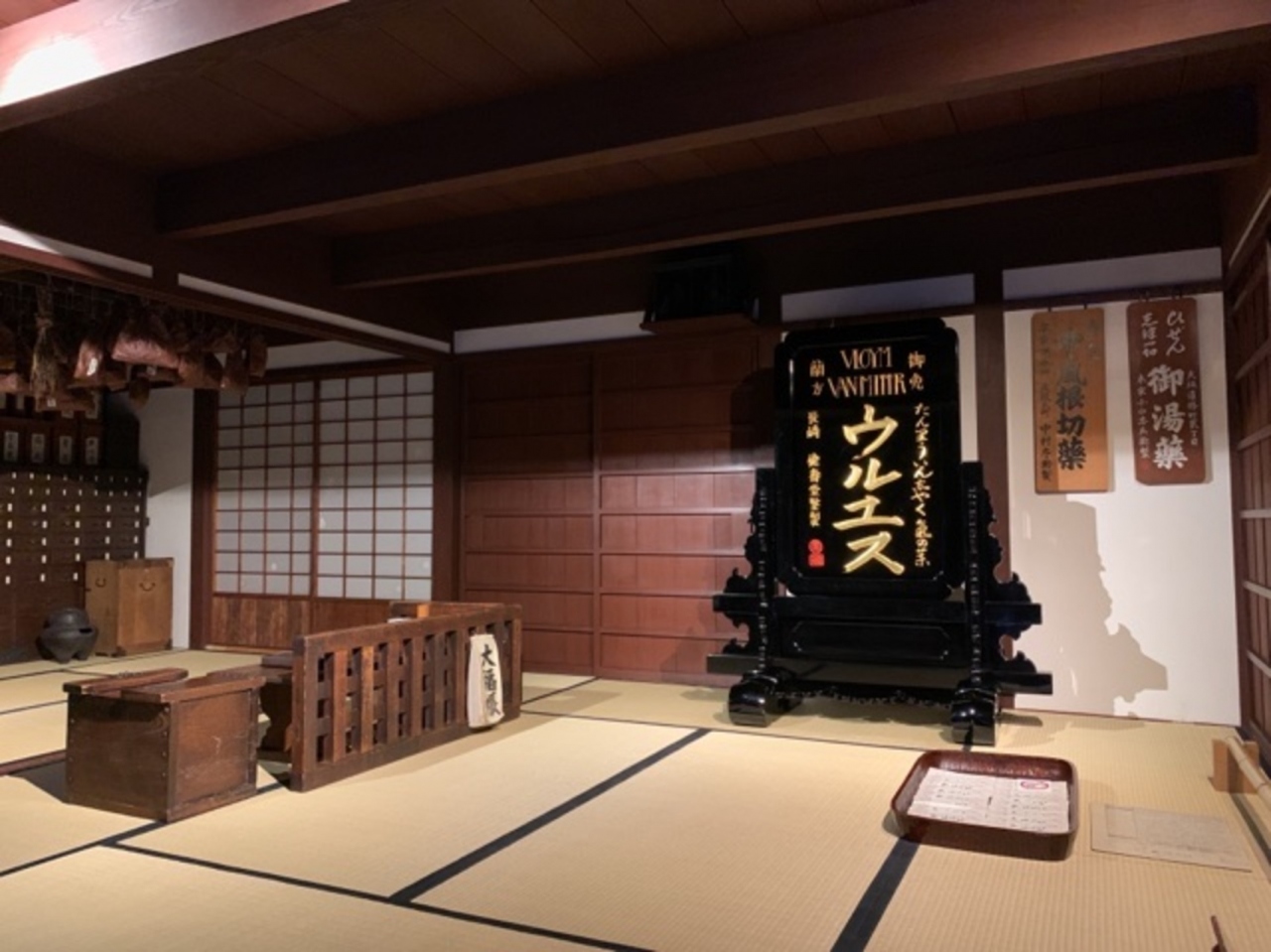 1番、なるほど!と思えたのは、江戸時代の薬屋さんの展示。 大きな看板"ウルユス"は、最初の洋名の薬として、江戸時代に大坂や江戸でかなり売れたそうです。 薬の名前がカタカナなので、オランダからの輸入薬と勘違いされたようですが、実際には植物の大黄を主成分とした緩下剤。 商品名のウ・ル・ユを一文字の漢字にすると、「空」になります。 "「空」ス"という意味で、体の中の悪いものを外に出して空にするという意味で付けられた名前だそうです。 凄いプラセボ効果ですね! でも漢方薬の大黄が成分なら、プラセボってわけでもナイのかな…。