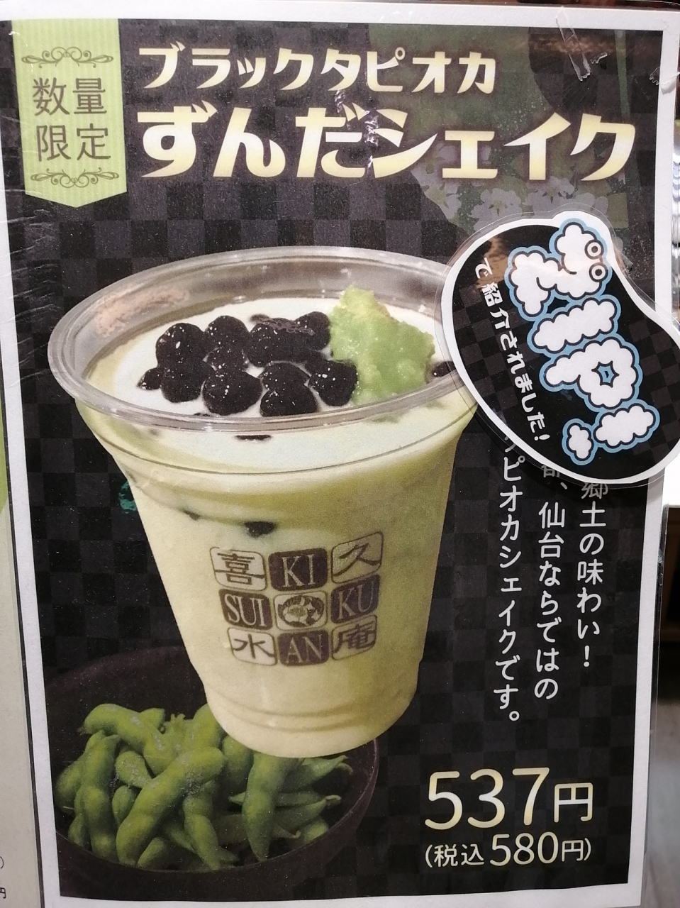 芸能人の方が美味しいと言っていたので、気になって訪れました。タピオカも入ってるので、かなりお腹にたまりますし、確かに美味しかったです。色んなずんだシェイクがあるので、各社飲み比べてみるといいのではないでしょうか。