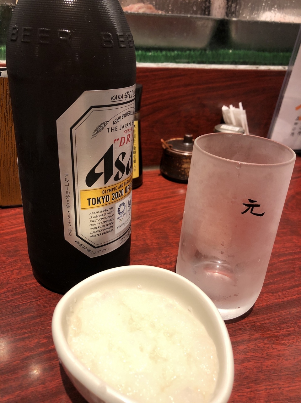 瓶ビールが来た…お通しは大根おろし、お代わりOKとのこと、醤油を2、3滴落としたけど、酢が少し効いていて下味が付いていた様だ