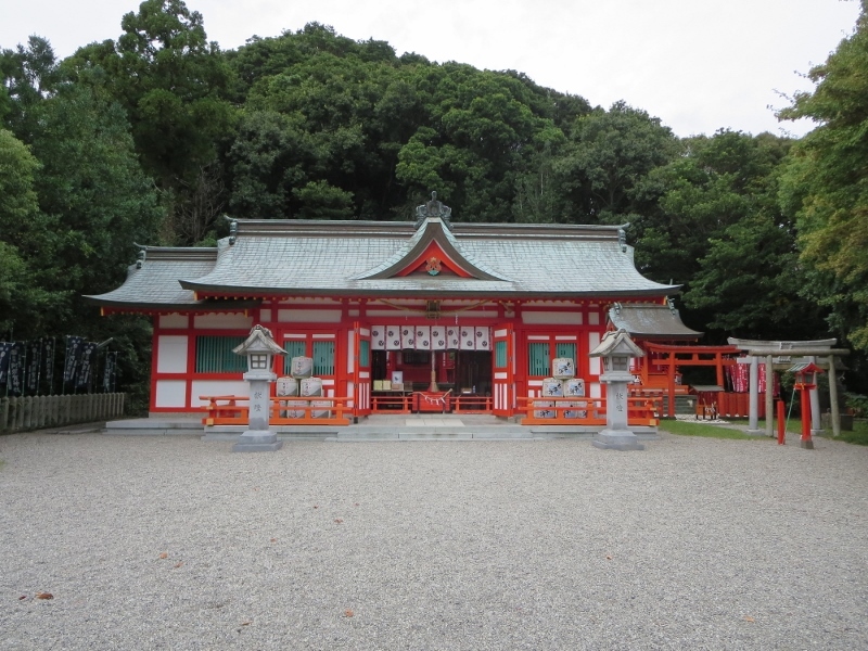 前回熊野巡りをした時には行かなかったので、今回は世界遺産を構成している神社なので行ってみました。熊野川の河口にあり、すぐそばには遺跡もありました。他にお参りしている人はいなくて静かでした。こんもりとした木立の緑が、社殿の朱色と白色を引き立てていました。