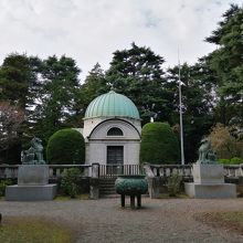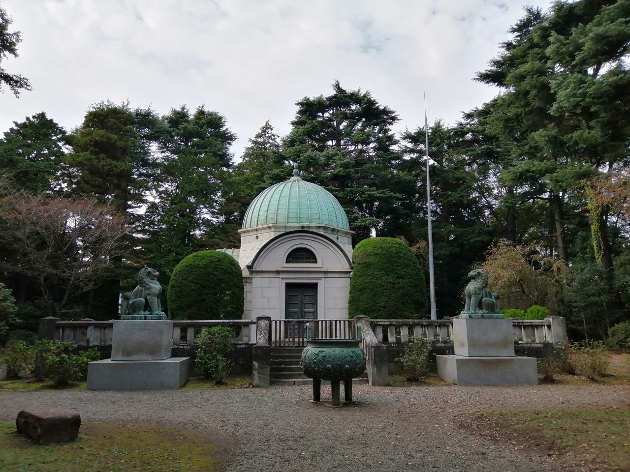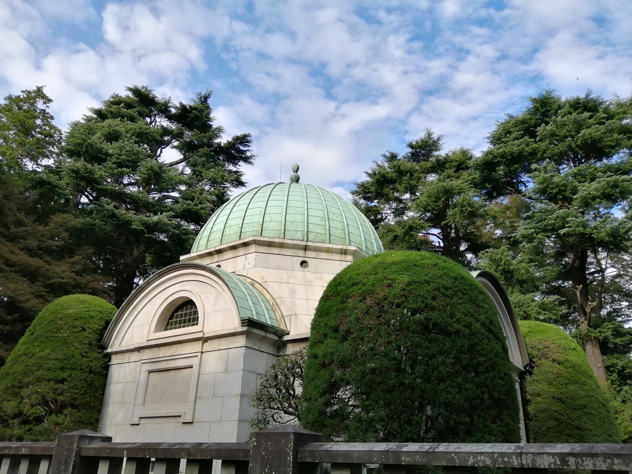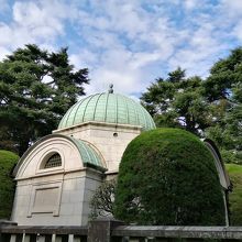 岡本静嘉堂公園の敷地内、静嘉堂文庫美術館近くにあります。明治時代を代表する建築家、ジョサイヤ・コンドルの設計です。青緑色のドームは、確かに同じコンドル設計のニコライ堂に似ています。岩崎彌之助など岩崎家のそうそうたる人物たちが納められてるとは言え、霊廟まで有名建築家の設計とはさすが三菱財閥です。