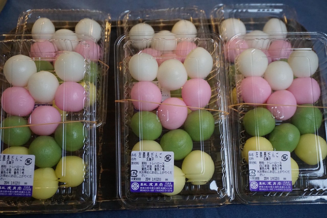 パンの蔵は、大磯駅から国道1号線に下りていく道の途中を脇に入ったところ。基本は、パン屋さんなんですが、この日は左義長。左義長の火で焼くお団子とお団子を吊るして火にかざす竿を売っていて、大勢の人が集まっていました。お祭りを彩るカラフルな団子が印象に残りました。