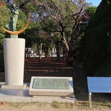 死没者慰霊碑を見守る位置にある母子像です。1977年に完成したそうです。若い母親に抱かれた子どもが平和のラッパを吹いています。かかっている三日月は「やがて満月になる」という未来へのイメージをふくらましていて、その横に草野心平氏の詩碑も建てられています。