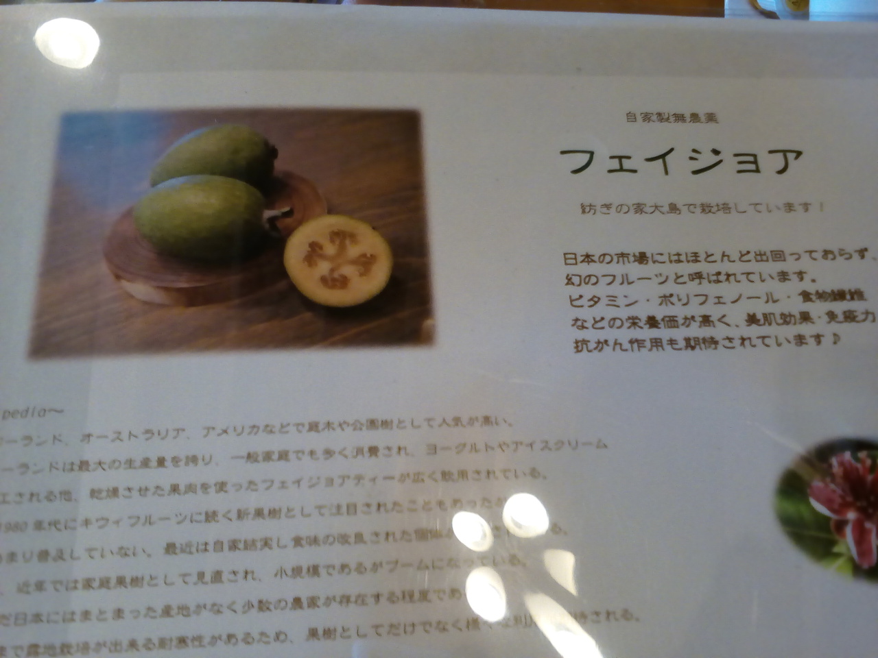 コロナ休業開け後、久しぶりに行きました。ランチ時だったので混んでいてけっこう待たされました。店内は程よくソーシャルディスタンスが保たれているので安心です。庭で採れたフルーツ(フェイジョア)がサービスで付きました。購入も可能だと。