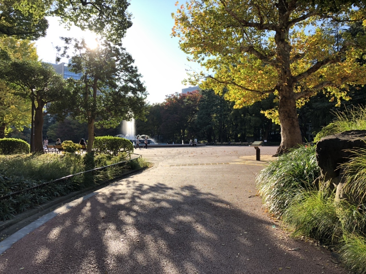 木々は紅葉が始まり、赤のバラが美しく咲いていてとても気持ちの良い散策でした。園内のベンチではたくさんの方がくつろいで、この自然を満喫していました。