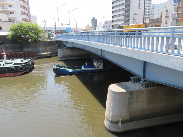 道頓堀川と言えば、グリコのネオンのイメージですが、この道頓堀川は案外長いです。川の両側の景色が変化していって楽しいです。汐見橋のあたりを散策していると、この橋の下を小さな船がくぐっていく光景を見ることができました。これは珍しい光景です。