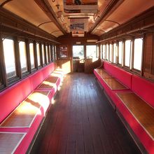 なんともオールドな外観。外からながめるだけでなく車内に入れるようになっているのがいいです。車内に入ると床や窓枠が木製です。つり革のない天井はすっきり。