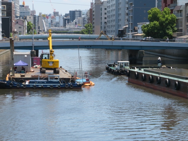 この橋はあみだ池筋沿いにある道頓堀川に架かる橋です。道頓堀川はグリコの看板の辺りはトンボリバークルーズ船ですが、この辺りは、小さな船が橋の下をくぐっていくという懐かしい光景が見られます。下町の雰囲気です。