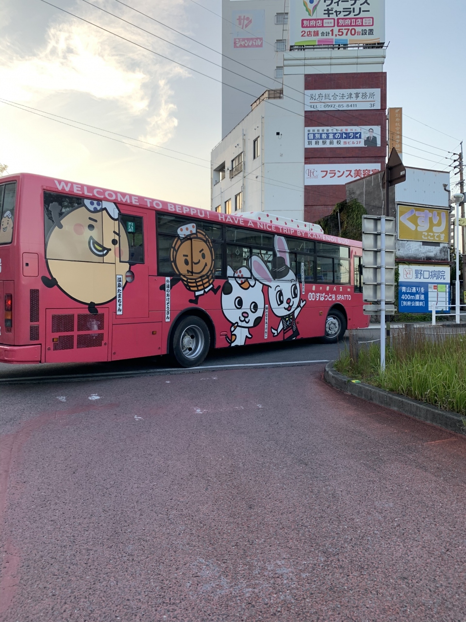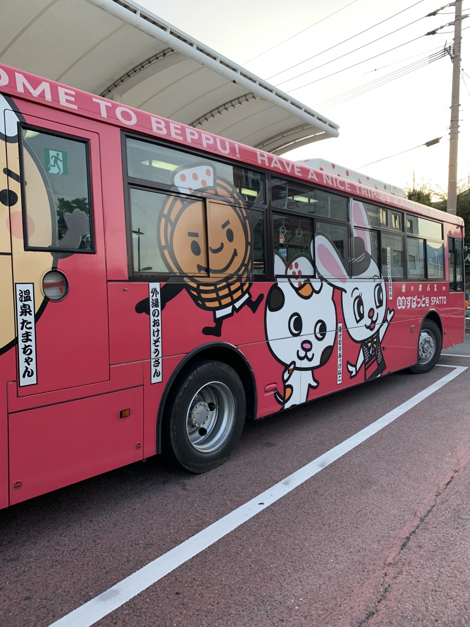 可愛いイラストが描かれた ピンクのバスは 「往復すぱっと号」です。