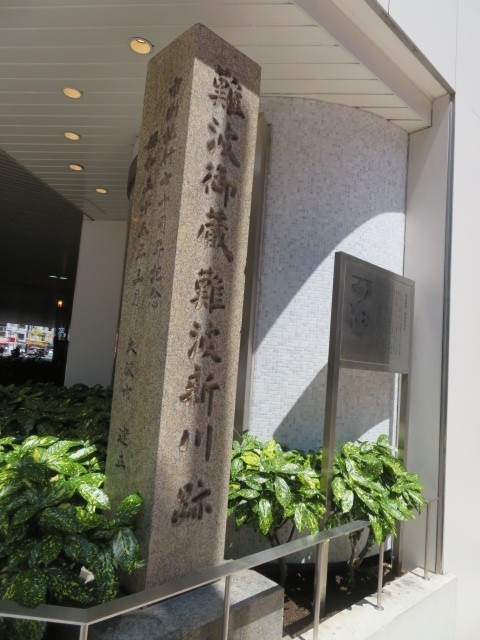 難波ウインズの近くのなんばパークスの入り口に寂しく石碑だけが立っています。江戸時代、この辺りには、難波御蔵と呼ばれた幕府の米蔵があったそうです。白い塀と松並木で囲まれた広大な敷地だったそうで、今のなんばパークスがそのまま米蔵だったと思うとすごいロマンですね。