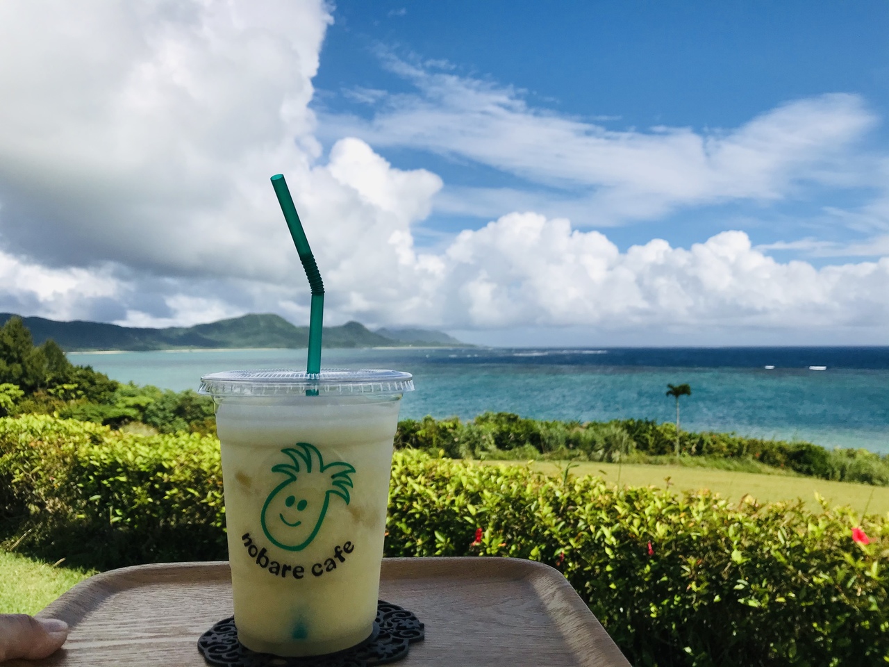 緑の芝生の上に置かれたテーブルの向こうには、石垣島の美しい海が広がってます。