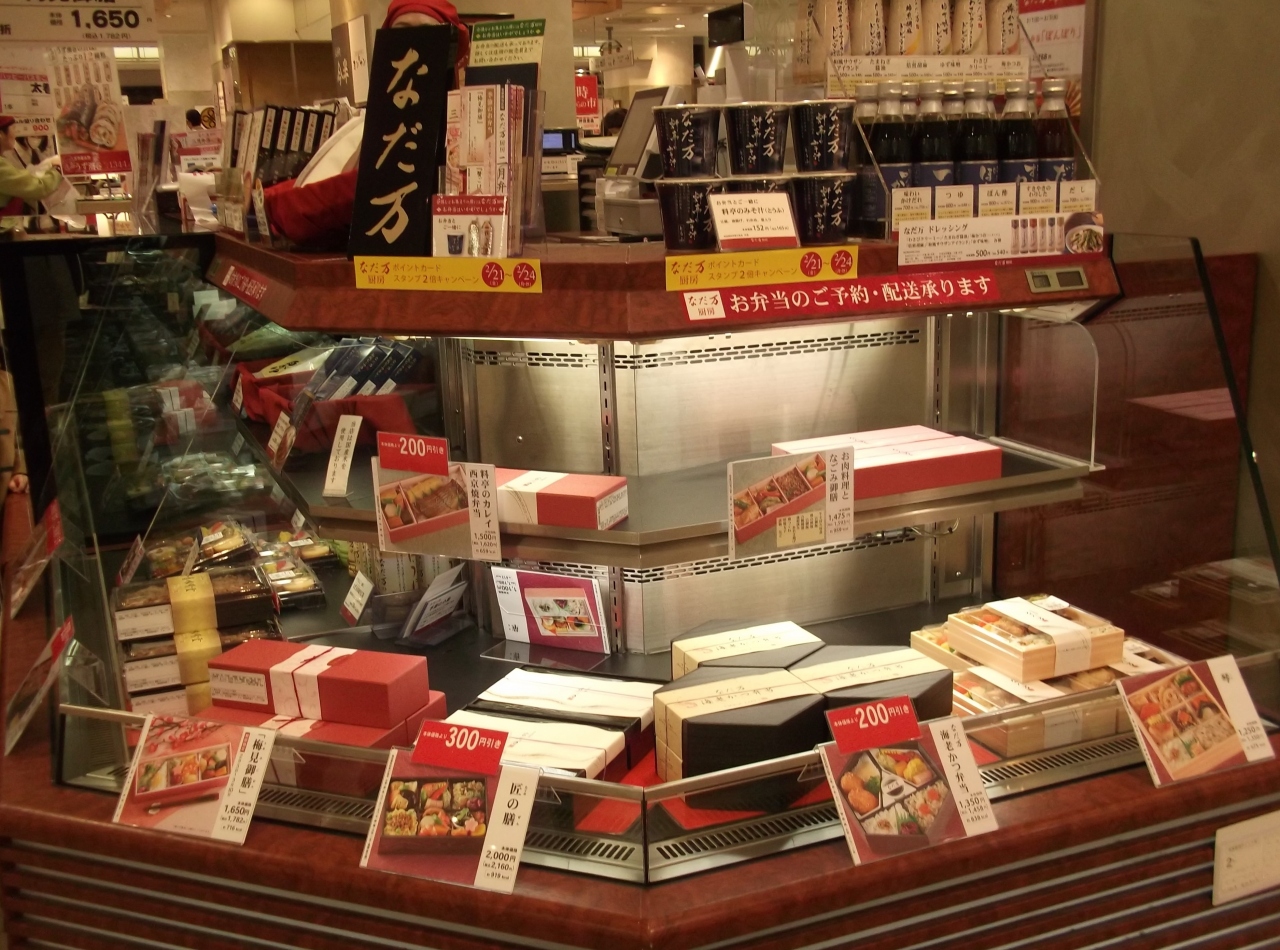 千葉そごうの地下にある、高級仕出し弁当のなだ万のショップです。ショーケースの中にはお弁当のほか、季節感のある惣菜がたくさん並んでいました。色々な料理が少しずつ納められた季節限定のお弁当を購入しました。さつま揚げ、つくね焼き、昆布、海老などの色とりどりのおかずが入っていて、五目ご飯といっしょにおいしくいただきました。