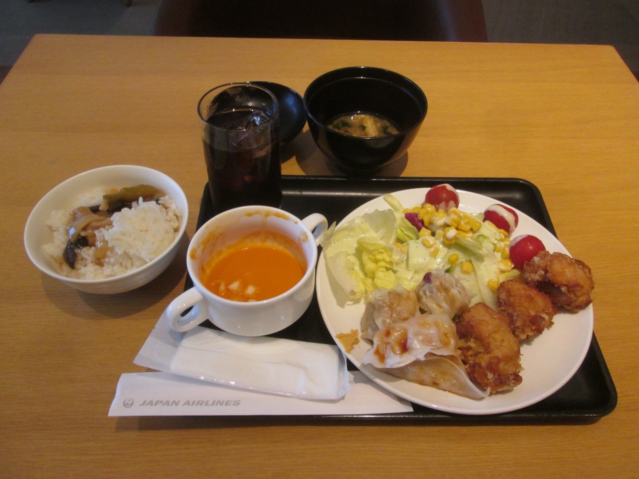 日本側の空港チェックインは4時間、5時間前でも可能です。夕食を食べずに早めに成田空港に到着し、サクララウンジでいただきました。温かい状態でフードメニューは揃っており、ビュッフェスタイルなので量を調整しながら利用できます。